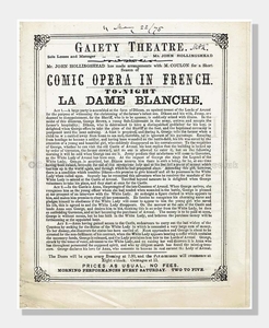 This 144-year-old theatre programme presents La Dame Blanche, for the The Gaiety Theatre’s Season of Comic Opera in French. The cover has the synopsis of the Opera in English as the cast is singing in French.