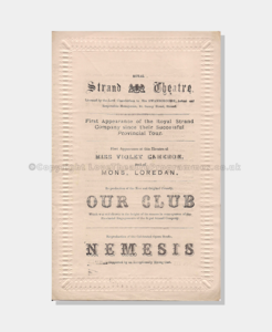 An embossed publication with simple printing black on white paper. Some interesting spellings/ misspellings. Notable for the introduction of new actors to the theatre – Miss Violet Cameron and Mons. Loredan. A full evening of entertainment.