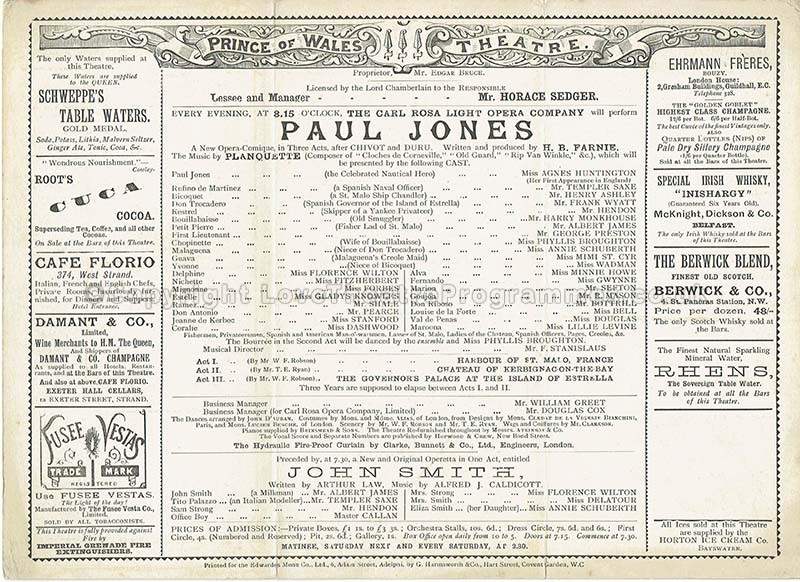 This 1889 theatre programme is in exceptional condition, partly because it is stiff card, and presents A New Opera-Comique, with Miss Agnes Huntington playing Paul Jones, a Celebrated Nautical Hero.