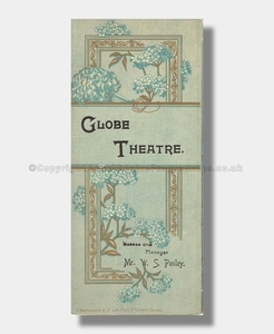 This attractive theatre programme, decorated in duck-egg blue and gold, presents Charley’s Aunt at the Globe Theatre in 1893. Mr. W.S. Penley, the Lessee and Manager of the theatre, played the starring role and the play was produced under the direction of the author, Mr. Brandon Thomas.