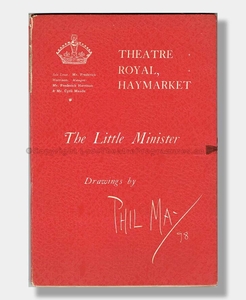 This hardcover souvenir contains 14 separate drawings of the characters in the play by Phil May, reproduced from the original pictures that were being exhibited at the Royal Academy at the time; one leaf of four photographs with printed signatures of J. M. Barrie, Winifred Emery, Cyril Maude and Frederick Harrisson; a photograph of the Theatre Royal, Haymarket. The cast list is on the inside of the front board.