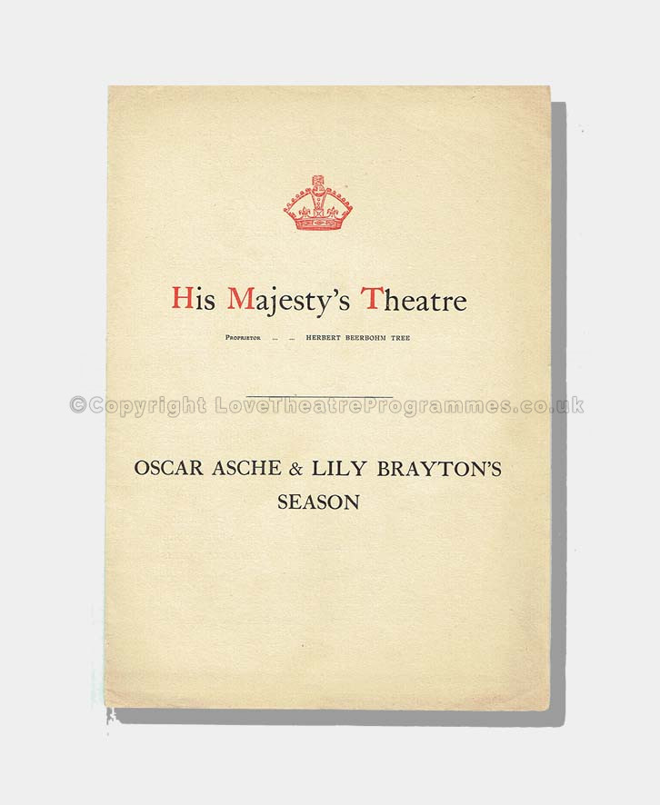 Oscar Asche and Lily Brayton were husband /wife actors that formed their own theatrical company in 1904. These theatrical entrepreneurs continued pushing the boundaries and in 1907 became co-managers of His Majesty’s Theatre, of which Herbert Beerbohm-Tree was the proprietor.