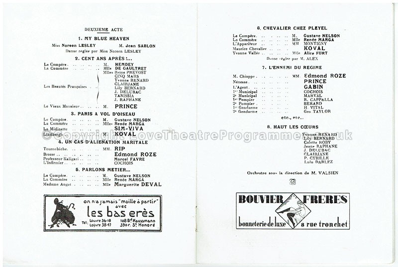 As expected with a revue, many actors, dancers and singers appear in this production including Georges Gabriel Thenon (nom de plume, and stage name: Rip), Edmond Roze, producer and actor, and Jean Sablon, singer and actor to name but a few. The programme also contains photographs of many of the cast.