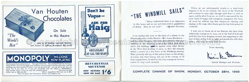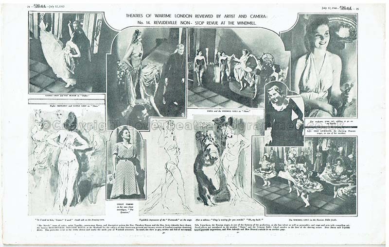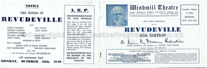 The Windmill Theatre (re-named The Windmill international in 1994), was a well-known theatre situated on Great Windmill Street in London, popular for the Review and Variety theatre performances. It was originally opened as a cinema in 1909 (Palais de Luxe) and was one of the first cinemas to show silent films however, due to the growth of larger cinemas in London, the cinema was forced to close. It wasn’t until 1930 that the building transformed into the Windmill Theatre. It was well known for its glamorous nudes on stage known as ‘The Windmill Girls’. The Windmill Theatre was always proud to announce that it never closed during World War II.