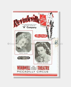 In this Revudeville programme there are photographs on the front cover of Margot Holden and Christine Welsford, two of the legendary Windmill Girls of the ‘Revudeville 18th Year’, ‘B’ Company’ 221st Edition. The internal pages are a mix of informative advertisements, detailed illustrations and smiley photos of Windmill Girls and entertainers of the performance.