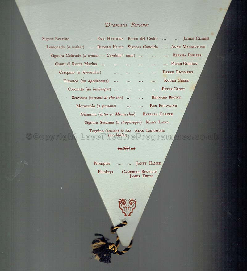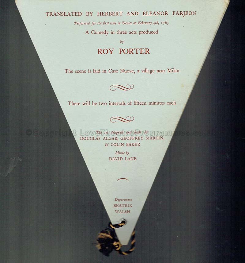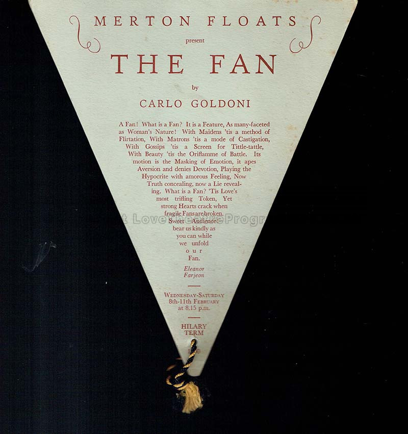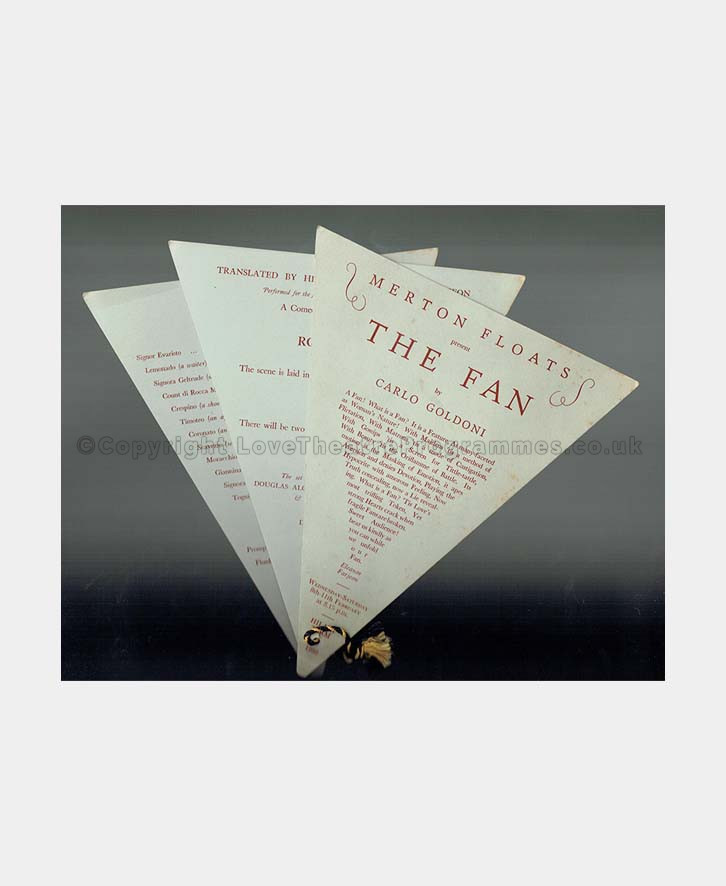 An innovative designed theatre programme for an adventurous farce; this rare theatre programme presents The Fan, first produced in 1765, written by Carlo Goldoni. In this galloping farce, a fan leads us through the complications of life, not a particular character.