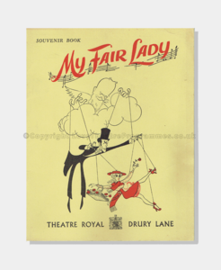 The programme is made up of a matt yellow card cover printed with red and black ink. The internal pages are a smooth beige paper printed with black ink. This programme contains delightful and interesting articles about the main cast of this performance. Page 4 of this programme contains a stunning full length black and white photo of the actress Anne Rogers. She plays the main character of Eliza Doolittle in this performance and is wearing Eliza’s beautiful evening attire stage costume and dripping in jewels.